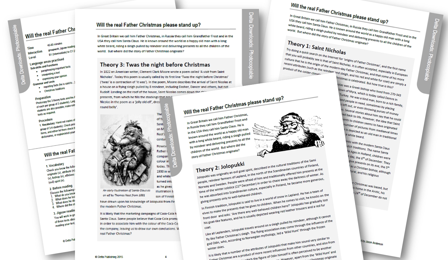 In case you are looking for a Christmas English lesson, click here, where my latest photocopiable activity is a jigsaw reading that explores the origins of the Father Christmas character. Students are involved not just in reading and regurgitating the texts, but they also have to interpret the data and share opinions. It’s great fun!